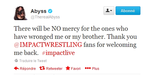 Abyss, qui a effectué son retour dans le ring de la TNA lors d'Imapct Wrestling jeudi soir, a commenté cet évènement via Twitter: