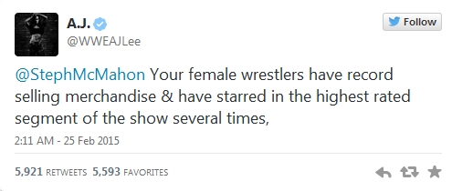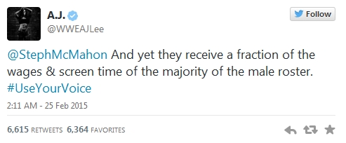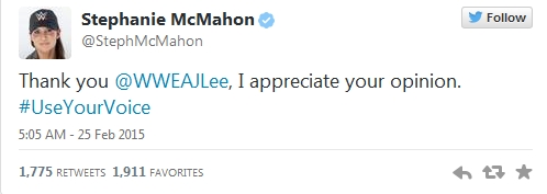 L'ancienne championne Divas de la WWE AJ Lee en a alors profité pour interpeller Stephanie McMahon sur le statut actuel des Divas à la WWE: