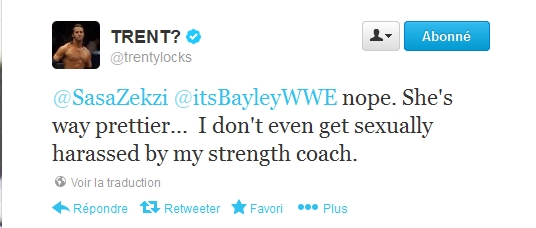 De l'autre côté, Trent Barreta répondant à la question d'une fan qui demande si Bayley est la version féminine de lui-même: