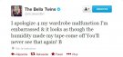 "Je m'excuse pour mon incident vestimentaire, je suis embarrassée et il semble que le ruban adhésif n'a pas tenu à cause de l'humidité. Vous ne verrez plus jamais cela !"