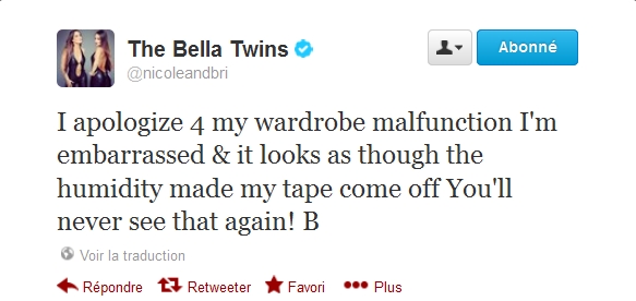 Brie Bella s'est excusée sur Twitter à propos du problème vestimentaire arrivé hier lors de Raw qui a laissé paraître le sein gauche de la jeune femme.
