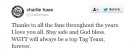 "Merci à tous les fans qui m'ont suivi toutes ces années. Je vous aime tous. Soyez sains et sauf, que Dieu vous bénisse. La Wrestling's Greatest Tag Team sera une équipe de première classe, pour toujours."