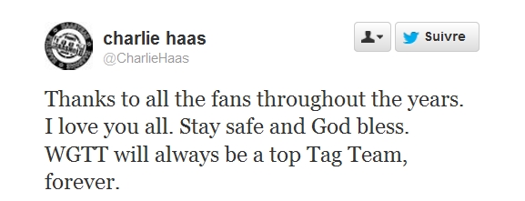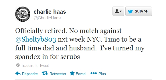 Charlie Haas, ancien catcheur de la WWE sous contrat avec la Ring of Honor, a annoncé sa retraite des rings via Twitter: