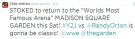 "EXCITE de revenir dans la "Salle la Plus Célèbre au Monde" MADISON SQUARE GARDEN ce samedi! #Y2J vs @RandyOrton va être un classique! @wwe @thegarden"