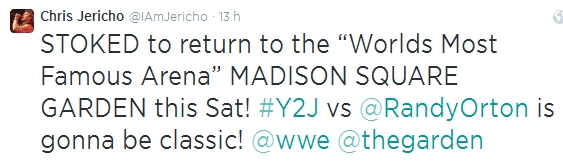Sur son compte Twitter, Chris Jericho a annoncé qu'il sera en action samedi soir lors du show spécial de la WWE au Madison Square Garden de New York dans un match contre Randy Orton qu'il aura précédemment affronté à Smackdown: