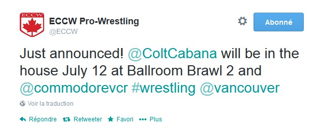 "Annoncé à l'instant ! Colt Cabana sera avec nous le 12 juillet à Ballroom Brawl 2 au Commodore de Vancouver"