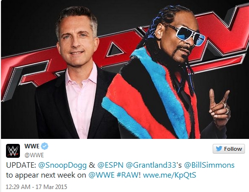 La WWE a annoncé les présences de Bill Simmons et de Snoop Dogg pour Monday Night RAW de lundi prochain à Los Angeles qui sera le tout dernier RAW avant Wrestlemania.