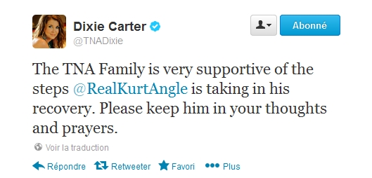 Dixie Carter, présidente de la TNA, a réagit sur Twitter suite à l'annonce de Kurt Angle qui va entrer en cure de désintoxication:
