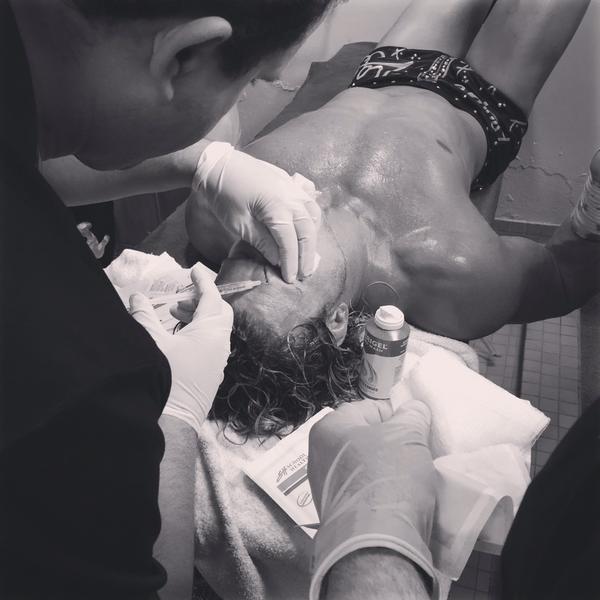 Ouvert profondément au-dessus de l'arcade sourcilière, Ziggler a fini le match en sang. Une fois revenu en coulisses, il a tout de suite été pris en charge par le médecin qui lui a posé dix points de suture comme le montrent les photos fournies par la WWE ci-dessus.