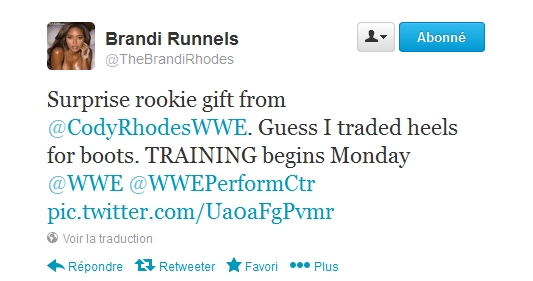 "Cadeau surprise de Cody Rhodes. Je suppose que je dois échangé les talons contre les bottes. Je commence l'entrapinement lundi au Performance Center de la WWE."