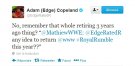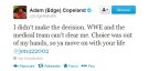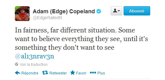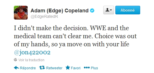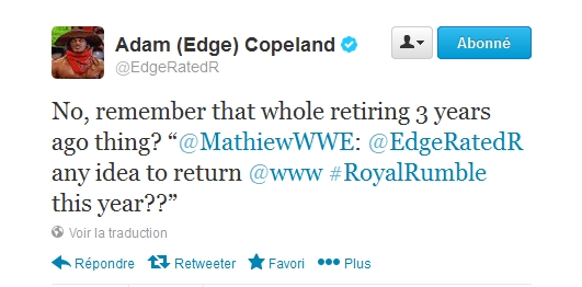 Un fan a répliqué que d'autres catcheurs avaient annoncé leur retraite pour finir par revenir, tels que Ric Flair, Terry Funk ou Shawn Micheals. Edge a répondu: