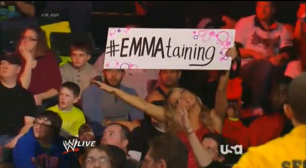 Pour la deuxième semaine de suite, Emma est apparue à l'écran lors de Monday Night Raw qui se tenait au Nutter Center de Dayton dans l'Ohio. Ci-dessous, la photo de la catcheuse en développement avec à la main une pancarte sur laquelle est inscrit "#Emmataining":