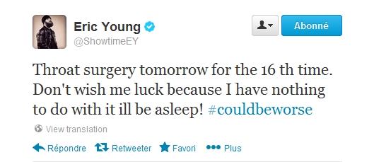 "Opération de la gorge demain pour la seizième fois. Ne me souhaitez pas bonne chance car je n'aurais rien à faire, je serais endormi ! #couldbeworse"