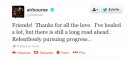 "Les amis ! Merci pour votre amour. j'ai été pas mal blessé, mais il y a toujours une longue route devant moi. Je continue de progresser sans m'arrêter..."