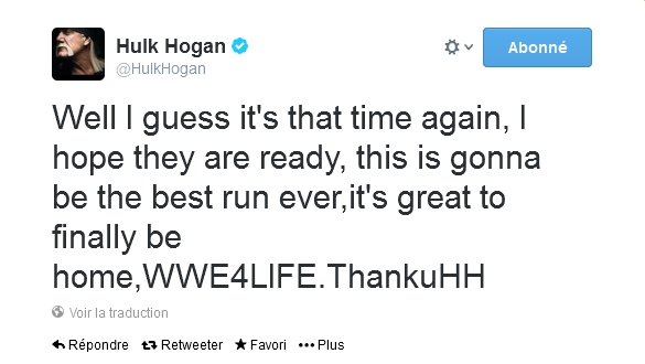 Hier, la WWE a officialisé le retour du Hulkster au sein de la fédération de Stamford. Hulk Hogan a réagit à l'annonce via son compte Twitter:
