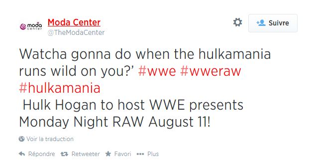 Le compte Twitter de du Moda Center de Portland en Oregon affirme que Hulk Hogan sera l'invité spécial de Raw le 11 août prochain. Ci-dessous le tweet en question: