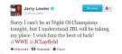 Jerry Lawler a affirmé sur Twitter qu'il ne sera pas présent aux commentaires pour le pay-per-view Night of Champions. Ce sera l'ancien champion poids lourd John Bradshaw Layfield qu'il le remplacera.