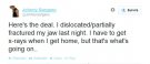 "Voici la situation. Je suis disloqué/partiellement fracturé la mâchoire hier soir. Je dois passer des radios lorsque je rentrerai chez moi, mais voilà ce qu'il se passe..."
