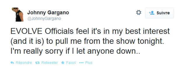 "Les dirigeants de l'EVOLVE pensent que c'est dans mon intérêt (et ça l'est) de m'écarter du show de ce soir. Je suis vraiment désolé si j'ai laissé tomber quiconque..."