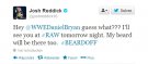 Le joueur de baseball Josh Reddick a tweeté dans la nuit qu'il sera présent ce soir à Monday Night Raw pour faire la rencontre de l'ex-champion de la WWE, Daniel Bryan. Ci-dessous le tweet de Reddick: