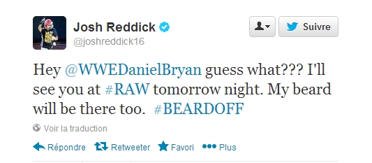 "Hey Daniel Bryan devine quoi ??? Je te verrai demain soir à Raw. Ma barbe sera aussi là #BEARDOFF"