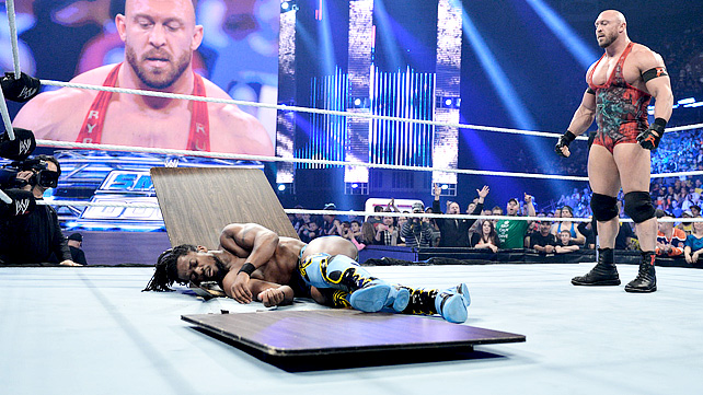 "Immédiatement après l'épreuve de force explosive entre Kofi Kingston et Ryback durant les enregistrements de Smackdown, The Human Wrecking Ball a brutalement attaqué le ghanéen, le faisant passé à travers trois tables différents.