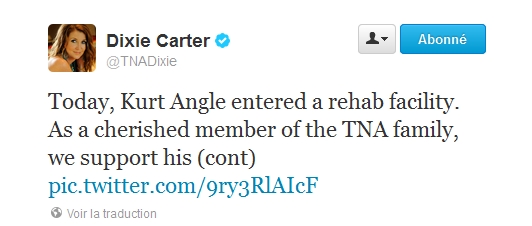Dixie Carter, présidente de la TNA, a annoncé cette nuit que Kurt Angle est entré ce lundi en cure de désintoxication, comme il l'avait annoncé la semaine dernière.