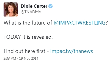 Sur son compte Twitter, la présidente de la TNA Dixie Carter a annoncé que le futur de la TNA sera dévoilé ce soir. Le sujet en sera le nouveau diffuseur après la diffusion ce soir du dernier show d'Impact Wrestling sur Spike TV: