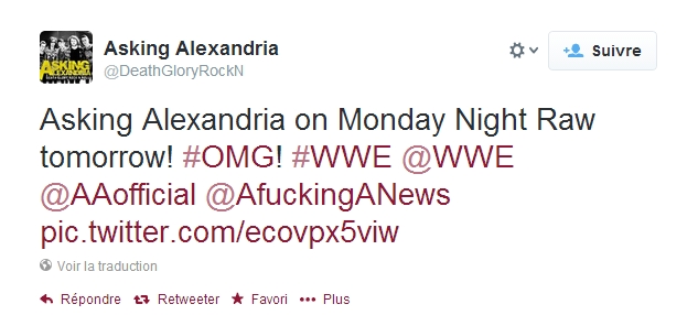 Le groupe britannique de métal Asking Alexandria a indiqué sur Twitter qu'ils seront présents ce soir à Monday Night Raw qui se tiendra dans le quartier de Brooklyn à New-York.