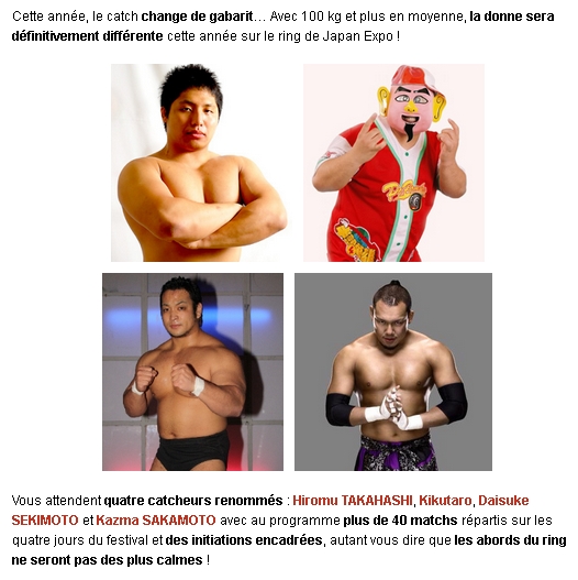 Le site japan-expo.com de la Japan Expo qui se tiendra au Parc des Expositions de Paris-Nord Villepinte du 4 au 7 Juillet prochain a annoncé le retour du catch :