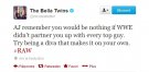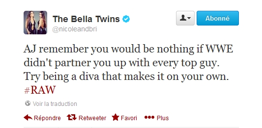 "AJ souviens-toi que tu ne serais rien si la WWE ne t'avait pas associé à chaque catcheur important. Essaies d'être une Diva par toi-même. #RAW"