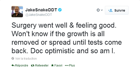 Le Jake "The Snake" Roberts a annoncé hier sur Twitter que son opération a été un succès. Longue de 5 heures, l'opération avait pour but de retirée la masse cancéreuse du genou gauche du futur Hall of Famer de la WWE. Ci-dessous le tweet de Roberts: