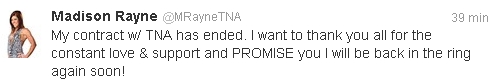 "Mon contrat avec la TNA a pris fin. Je voudrais tous vous remercier pour votre amour et soutien constant et je vous PROMETS que je serai prochainement à nouveau de retour sur le ring."