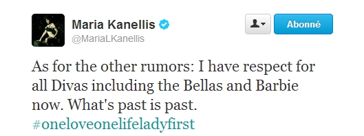 "En ce qui concerne ces rumeurs: je respecte aujourd'hui toutes les divas, incluant les Bellas et Barbie. Ce qui passé reste passé. #oneloveonelifeladyfirst"