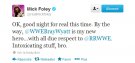 "OK, bonne soirée pour de vrai cette fois. Au fait, Bray Wyatt est mon nouvel héros...avec tout le respect que je dois à Ricardo Rodriguez. Des actes enivrantss"