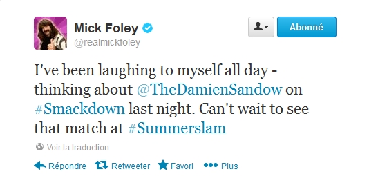 "J'ai ri seul toute la journée en pensant à Damien Sandow à Smackdown hier soir. J'attends avec impatience son match à Summerslam."