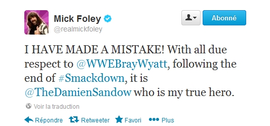 Mick Foley, Hall of Famer de la WWE, a félicité sur Twitter de Dean Ambrose et Damien Sandow pour le travail à Smackdown. Ci-dessous les tweets de Foley: