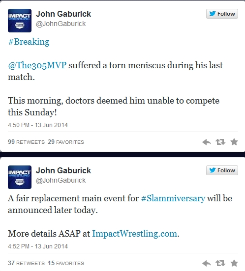 Un remplacement juste du main event de #Slammiversary sera annoncé ce soir. Plus de détails à venir."