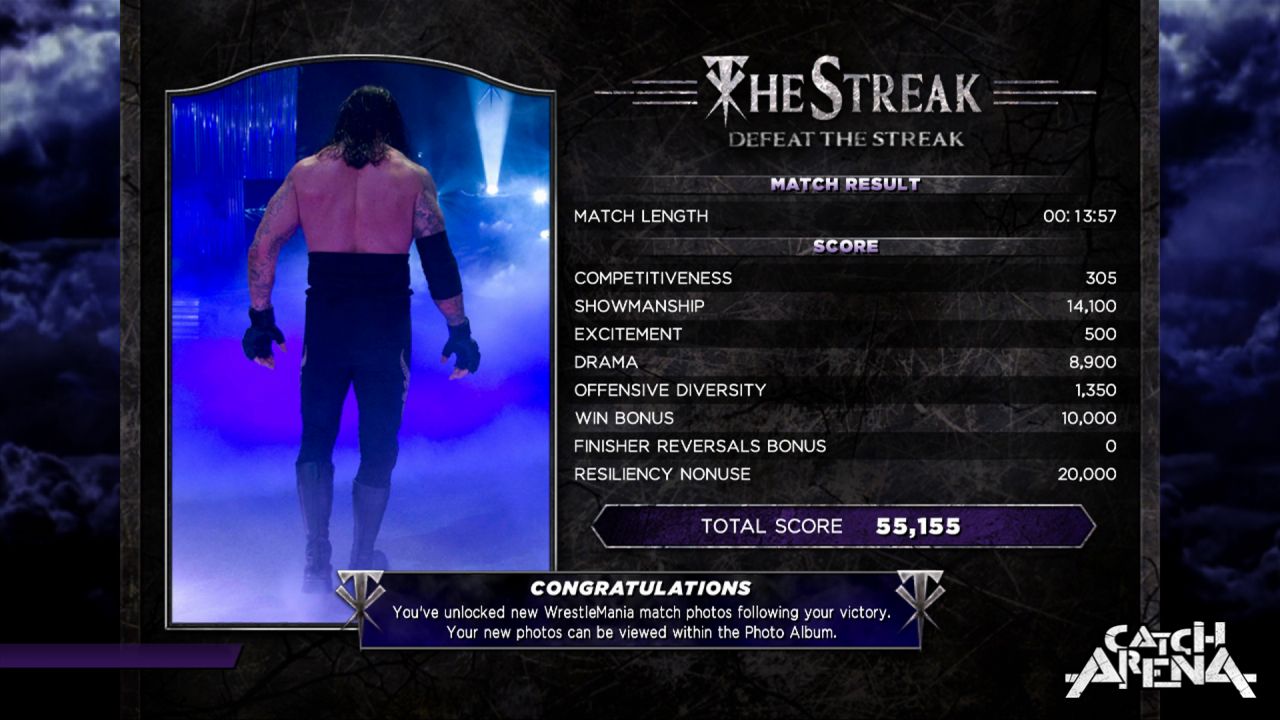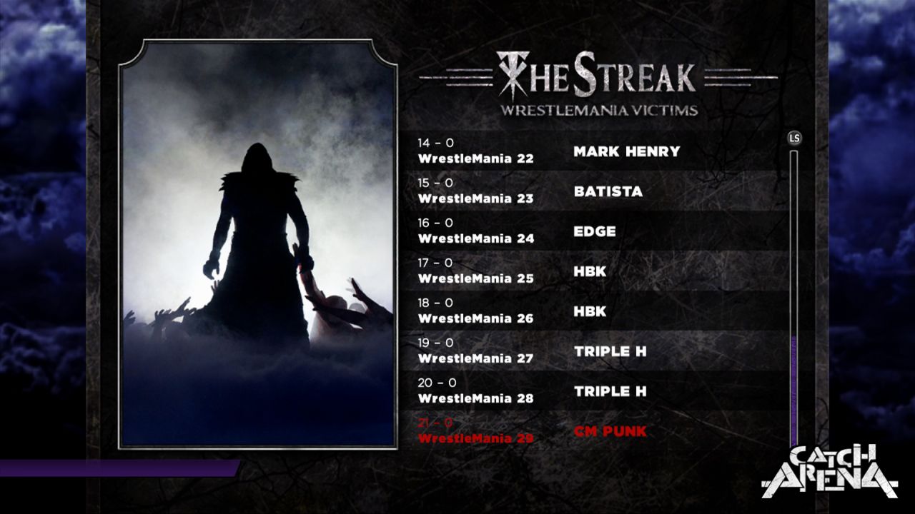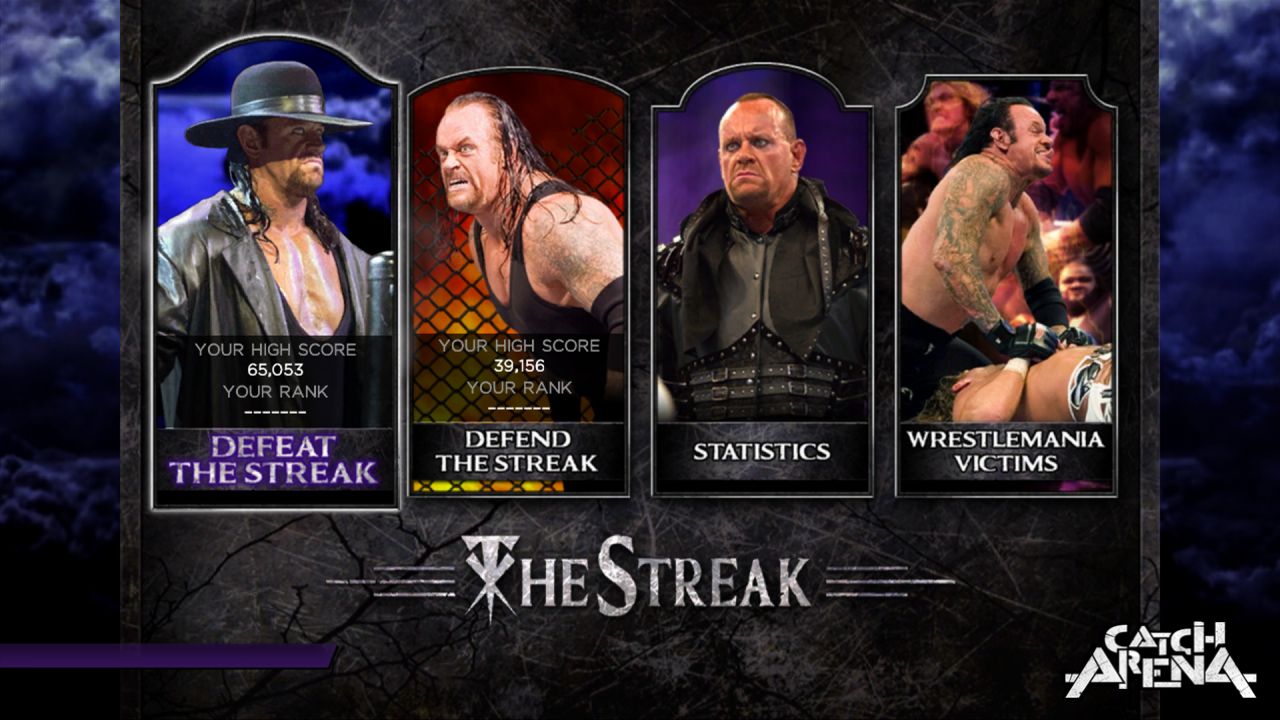 L'autre mode de jeu qui retiendra particulièrement votre attention, c'est celui qui concerne la Streak de l'Undertaker. En effet, vous aurez deux choix, soit incarner l'Undertaker et poursuivre la Streak, soit incarner un autre catcheur et tout faire pour la stopper. A la clé, pas de bonus malheureusement, seulement des statistiques à comparer avec vos amis... ce qui est fort dommage.