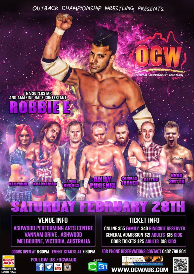 L'Outback Championship Wrestling a annoncé la venue de la Superstar de la TNA Robbie E pour son show du 28 Février à Ashwood dans la banlieue de Melbourne en Australie.