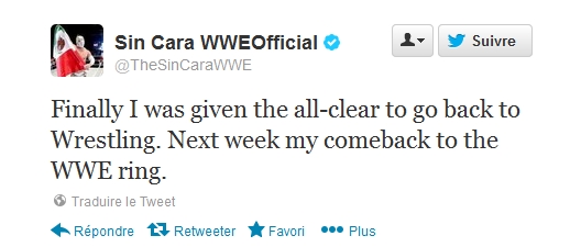 N'étant plus apparu dans un show télé de la WWE depuis sa défaite contre Jack Swagger le 11 mars dernier à Raw, Sin Cara a annoncé sur Twitter qu'il ferait son retour la semaine prochaine. Ci-dessous, le tweet du luchador: