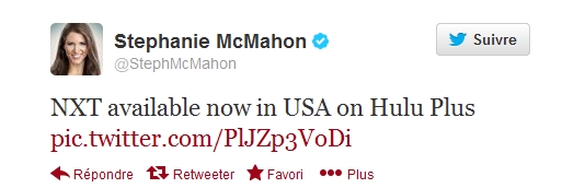 Stephanie McMahon a publié sur son compte Twitter une photo de la ceinture féminine de NXT qui sera mise ne jeu dans un tournoi à partir de la semaine prochaine. Elle indique dans son message que NXT est désormais disponible sur la plateforme Hulu Plus: