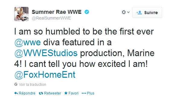 La Diva Summer Rae a révélé sur Twitter qu'elle fera partie du quatrième opus de la saga The Marine, saga dans laquelle The Miz occupe le rôle principal. Ci-dessous le tweet de la jeune femme: