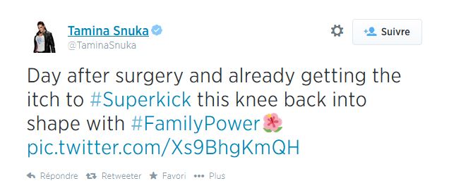 Tamina Snuka, dont le dernier match date du 27 mai pour les enregistrements de Smackdown contre Paige, a subi une opération du genou gauche cette semaine. Ci-dessous le tweet et la photo postés par la Diva: