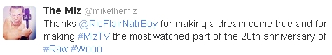 "Merci @RicFlairNatrBoy pour avoir fait de mon rêve une réalité et pour avoir fait de #MizTV la partie la plus regardée du 20ème anniversaire de #Raw #Wooo"
