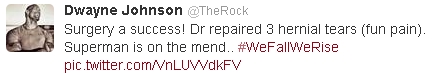 Lundi dernier, The Rock a été opéré des blessures à l'abdomen qu'il avait contractées lors de son match contre John Cena à Wrestlemania 29 le 7 Avril dernier où il avait perdu le titre de la WWE. Il a donné directement de ses nouvelles sur Twitter, disant que l'opération s'était bien passée, photo à l'appui :