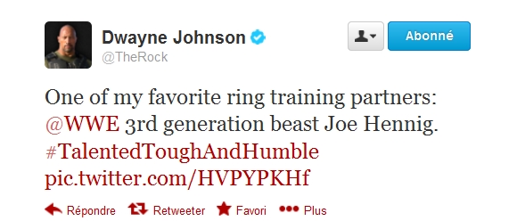 "Un de mes partenaires d'entraînement préférés dans le ring: la bête de troisième génération de la WWE Joe Hennig #TalentueuxCoriaceetHumble"