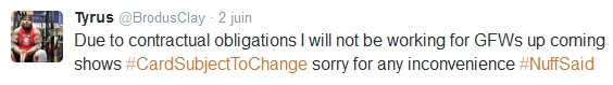"En raison de mes obligations contractuelles je ne travaillerai pas pour les shows à venir de la GFW #CarteSujetteAChangement désolé pour le dérangement #NuffSaid."