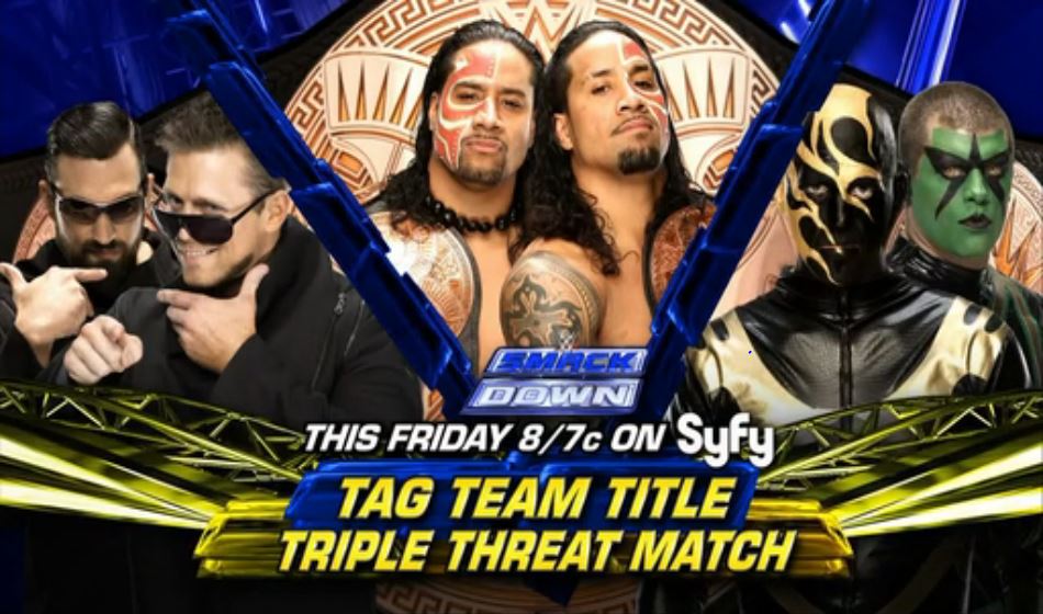 Jimmy Uso et Jey Uso défendront leur titre par équipe face aux anciens champions The Miz et Damien Sandow mais aussi face à Goldust et Stardust.