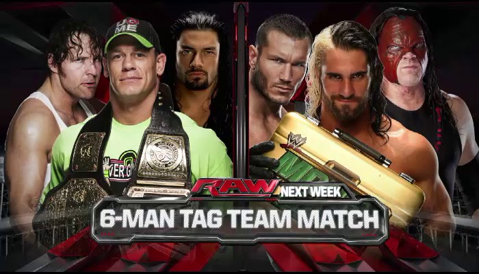 Le main event de RAW sera un match par équipe à 3 contre 3 où le champion du monde poids-lourd John Cena fera équipe avec les deux anciens compères du Shield Dean Ambrose et Roman Reigns pour affronter les trois hommes de l'Autorité Seth Rollins, Randy Orton et Kane.